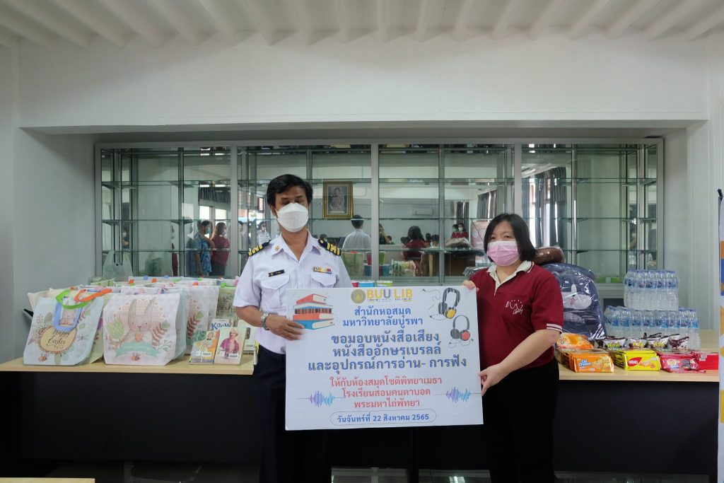 โครงการ “หนังสือเสียงและหนังสืออักษรเบรลล์: ส่งต่อความรู้สู่ผู้พิการทางสายตา” / กิจกรรม, กิจกรรมบริการวิชาการ / By Sommay Limpitipanich สำนักหอสมุด มหาวิทยาลัยบูรพา นำหนังสือเสียง หนังสืออักษรเบรลล์ อุปกรณ์การบันทึกเสียงและการฟังมอบให้กับห้องสมุดโชติพิทยเมธา โรงเรียนสอนคนตาบอด พระมหาไถ่พัทยา รับมอบโดยนายชิด สุขหนู ผู้อำนวยการโรงเรียนสอนคนตาบอดพระมหาไถ่พัทยาในพระราชูปถัมภ์สมเด็จพระเทพรัตนราชสุดาฯ สยามบรมราชกุมารี ในโครงการ “หนังสือเสียงและหนังสืออักษรเบรลล์: ส่งต่อความรู้สู่ผู้พิการทางสายตา” เมื่อวันที่ ๒๒ สิงหาคม ๒๕๖๕