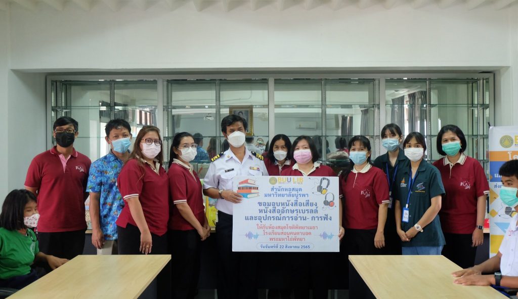 สำนักหอสมุด มหาวิทยาลัยบูรพา นำหนังสือเสียง หนังสืออักษรเบรลล์ อุปกรณ์การบันทึกเสียงและการฟังมอบให้กับห้องสมุดโชติพิทยเมธา โรงเรียนสอนคนตาบอด พระมหาไถ่พัทยา รับมอบโดยนายชิด สุขหนู ผู้อำนวยการโรงเรียนสอนคนตาบอดพระมหาไถ่พัทยาในพระราชูปถัมภ์สมเด็จพระเทพรัตนราชสุดาฯ สยามบรมราชกุมารี ในโครงการ “หนังสือเสียงและหนังสืออักษรเบรลล์: ส่งต่อความรู้สู่ผู้พิการทางสายตา” เมื่อวันที่ ๒๒ สิงหาคม ๒๕๖๕